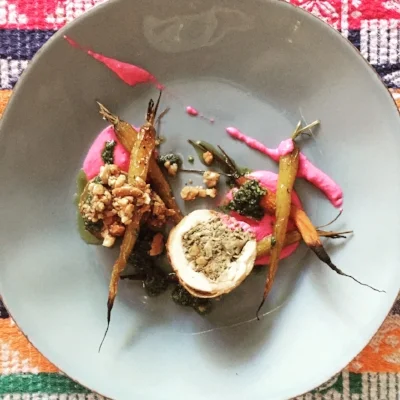 Sri lankan curried chicken galantine, @westerlyfarms carrots, honey beet yoghurt, cashew brown butter on roasted sweet potato